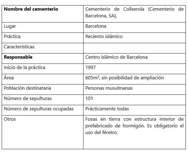 Por otro lado, existen algunos cementerios con áreas o parcelas para los funerales islámicos como pasa en el conjunto de todo el Estado español a base del Acuerdo de Cooperación entre el Estado español y la Comisión islámica de España del año 1992 por el cual los musulmanes tienen derecho a disponer de un espacio reservado en los cementerios municipales, en el que los difuntos puedan ser enterrados según el rito islámico. Por eso, se encuentran estos tipos de espacios sobre todo en Barcelona (en el cementerio de Collserola) y en la localidad de Manresa (en el Cementerio Municipal), pero en la mayor parte de las localidades catalanas no existe esta posibilidad como el caso de Lleida donde los responsables municipales afirman no haber recibido ninguna petición (ni verbalmente ni por escrito), por parte del colectivo musulmán para poder realizar entierros islámicos (Solé-Arraràs, 2015).