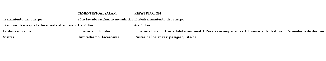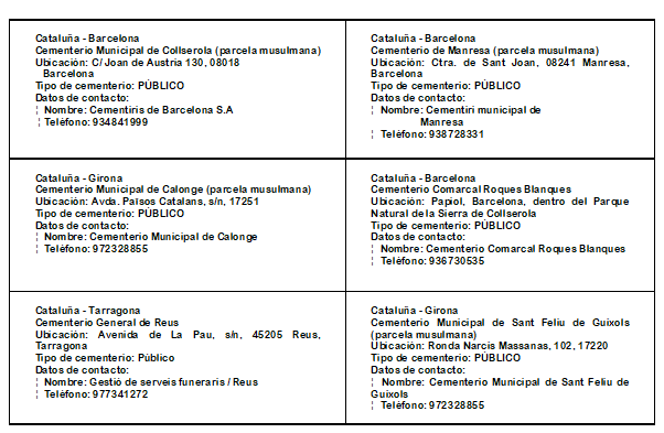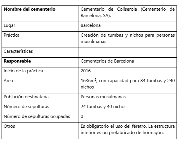 También, se ha dejado abierta la posibilidad de poder hacer la repatriación de cadáveres por parte de las familias siempre con permiso de la autoridad sanitaria. Además, el Cementerio Comarcal Roques Blanques, ubicado en la comarca del Baix Llobregat, provincia de Barcelona. En este cementerio el recinto para la comunidad islámica está ubicado en la Agrupación VI, en una zona rodeada de naturaleza, y está integrado en el Parque Natural de la Sierra de Collserola. Está conformado por 84 unidades de entierro, habilitados según los requerimientos de la religión musulmana y están construidos directamente en la tierra, orientados a la Meca y cubiertos con una gran lápida de granito donde se graban los datos del difunto (https://revistafuneraria.com, 2021).
