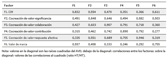 A partir de los resultados del AFC se afirmó la fiabilidad de todas las escalas, ya que los valores de fiabilidad compuesta y el coeficiente alfa de Cronbach eran superiores a los valores recomendados de 0,7 (Nunnally and Bernstein, 1994) para todos los constructos (tabla 1). Para valorar la validez convergente se llevó a cabo el análisis de las cargas totales estandarizadas, que eran superiores a 0,6 (Hair et al., 2017). Todas las cargas eran estadísticamente significativas para todos los ítems. Además el análisis de varianza extraída —AVE— constató que sus valores superaron el valor crítico de 0,5 establecido en la literatura (Fornell and Larcker, 1981). Todo ello permitió confirmar la fiabilidad de las escalas y la validez convergente de los constructos propuestos.