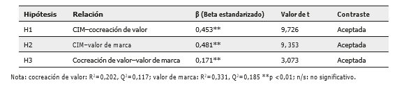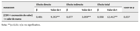 Por otra parte, los resultados también proporcionan apoyo empírico para la mediación de la cocreación de valor en las relaciones entre la CIM y el valor de marca. Dado que tanto los efectos directos como indirectos entre la CIM y el valor de la marca son significativos se concluyó que la cocreación de valor media parcialmente esta relación. El producto (valor de p) del efecto directo e indirecto muestra una mediación parcial complementaria, ya que su signo es positivo (Hair et al., 2017). Los resultados obtenidos se muestran en la tabla 4