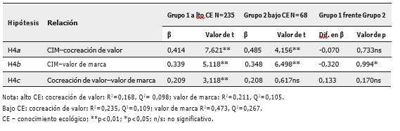 observa que (i) las relaciones entre la CIM y la cocreación de valor y (ii) las relaciones entre la cocreación de valor y el valor de marca no tienen diferencias significativas entre dos grupos, por lo que no se aceptan las hipótesis H4a y H4c. En cambio, la relación entre la CIM y el valor de marca presenta una conexión más fuerte para la muestra de bajo nivel de conocimiento ecológico que demuestra unos resultados relevantes a la luz de esta investigación y lleva a la aceptación de la hipótesis H4b que permite señalar el efecto moderador en esa relación.