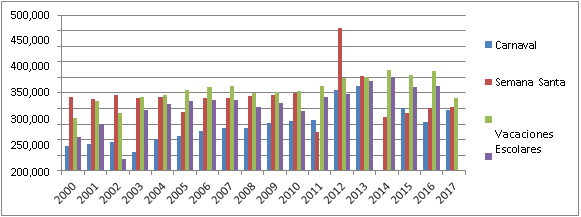 El análisis descriptivo de los datos de afluencia turística para el período 2000-2017 destaca que durante la Semana Santa arriban al Estado la segunda cantidad de turistas más elevada (29 % en promedio de la totalidad de turistas anuales), solo superada durante la temporada de vacaciones escolares con un 32 %; pese a su breve duración (9 días) frente a otras temporadas tales como Navidad y vacaciones escolares, 30 y 60 días respectivamente (figura 1).