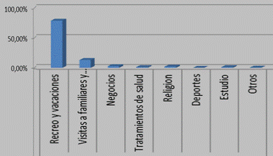El principal motivo de visita durante la temporada estudiada fue el recreo y las vacaciones con un promedio porcentual del 74,78 %, seguido de la visita a familiares y amigos con un 14,58 %; en contraste con la escasa proporción de viajeros por motivos religiosos, pese a que los encuestados podían seleccionar varias alternativas de respuesta (figura 2). Esta escases es paradójica, siendo explicada por Aulet y Hakobyan (2011) al indicar que dentro del turismo religioso se contabilizan o movilizan personas con otros motivos (festividad, lo cultural y natural, curiosidad, ocio y descanso).