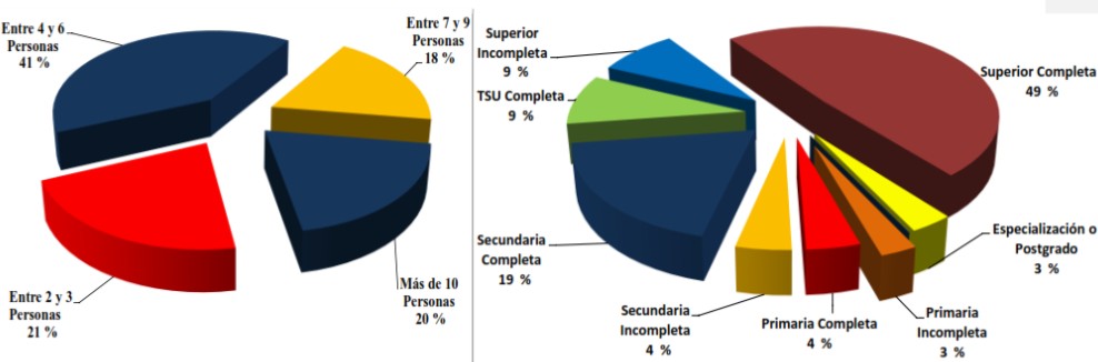 En lo que se refiere al tamaño de grupo de turistas, cabe destacar que la mayor proporción viaja en grupos de 4 y 6 personas; el 62 % de los grupos esta entre 2 y 6 personas, obteniendo un valor promedio de 7,5 personas por grupo. A pesar de que la mayoría de los grupos se conformaron entre 2 y 6 personas tambíen se hallaron grupos con más de 20 personas, por lo que el promedio se inclina a valores extremos. Sobre el nivel educativo del jefe del grupo familiar se observó que más del 60 % de los entrevistados tienen un nivel educativo universitario (incompleto y completo) seguido de secundaria completa (19 %) (figura 3).