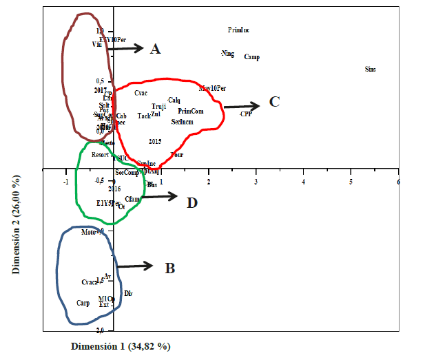 Posteriormente se describieron las características y aspectos clave del comportamiento de la afluencia turística durante las temporadas mencionadas como variables manifiestas u observables y se realizó un análisis multivariante de correspondencia múltiple, utilizando el software R a través del uso particular del comando PRINCOMP.
