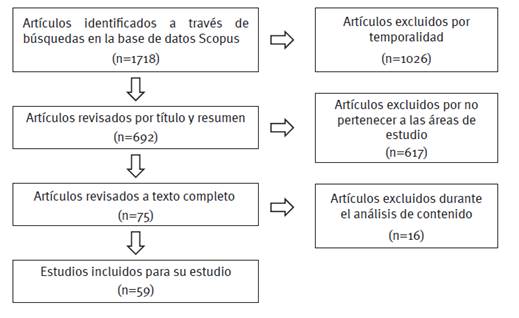 (iv) En la etapa final de los 75 artículos científicos revisados se descartaron 16 por irrelevancia temática, por lo que se incluyeron 59 documentos para su análisis.