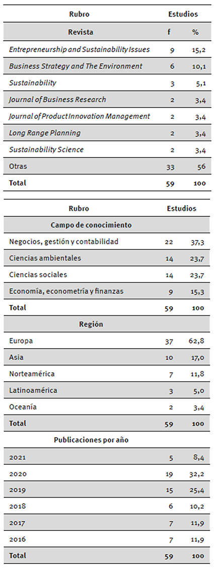 En la tabla 1 se concentra el listado de las revistas más sobresalientes de la investigación, evidenciando que la revista Entrepreneurship and Sustainability Issues tiene el mayor número de artículos publicados sobre innovación y sustentabilidad empresarial. También se muestran los campos de conocimiento en los que se ubican los artículos, observando que “negocios, gestión y contabilidad” tiene mayor predominio. En cuanto al origen geográfico se evidencia que Europa es la región con más porcentaje de estudios. Finalmente el 2021 destaca por la cantidad de publicaciones, evidenciando la necesidad emergente del objeto de estudio.