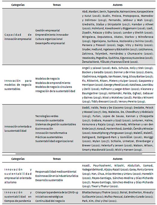 Con base en los artículos científicos seleccionados se elaboró la tabla 2 con el fin de clasificar el tipo de contribuciones al estado de conocimiento de acuerdo con su perfil temático. Se puede apreciar la clasificación de los artículos científicos analizados por cinco diferentes categorías, a saber: capacidad de innovación empresarial; innovación para modelos de negocio sustentables; innovación orientada a la sustentabilidad; innovación y sustentabilidad empresarial orientada al turismo e innovación y sustentabilidad en tiempos de pandemia.