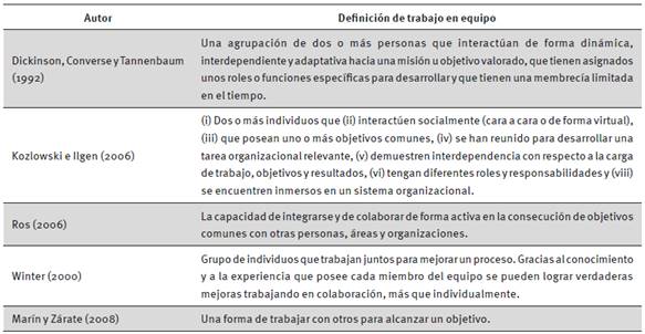Hay múltiples definiciones para el concepto de trabajo en equipo aportadas por diversos autores, pero una definición simple de este hace referencia a un conjunto de individuos que trabajan por la consecución de un objetivo común y que en su forma de trabajar se observan situaciones que los caracteriza. A continuación, se ofrece en la tabla 1 una recopilación de la definición de trabajo en equipo desde el punto de vista de diferentes autores.