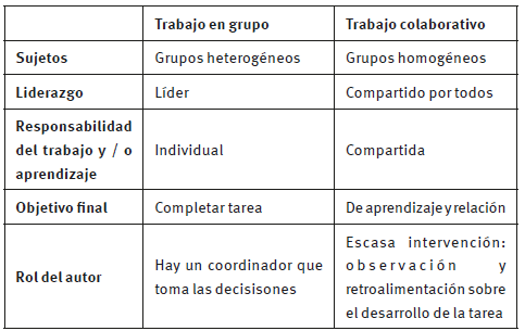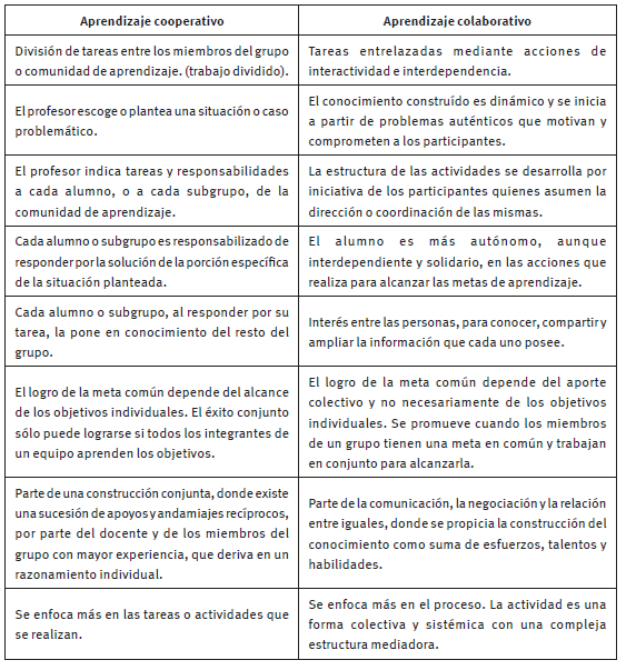 Peña, Pérez y Rondón (2010) establecen diferencias entre el aprendizaje cooperativo y el colaborativo, en el primero comentan que “consiste en trabajar conjuntamente para concretar, en forma distribuida, una meta” (p. 188) en la que todos los miembros contribuyen no solo a su aprendizaje sino influir en el de los demás. En cuanto al trabajo colaborativo refieren que este “se fundamenta principalmente en la unión de esfuerzos” (p. 190), es decir, se trabaja en una forma compartida en la que se distribuye la autoridad.