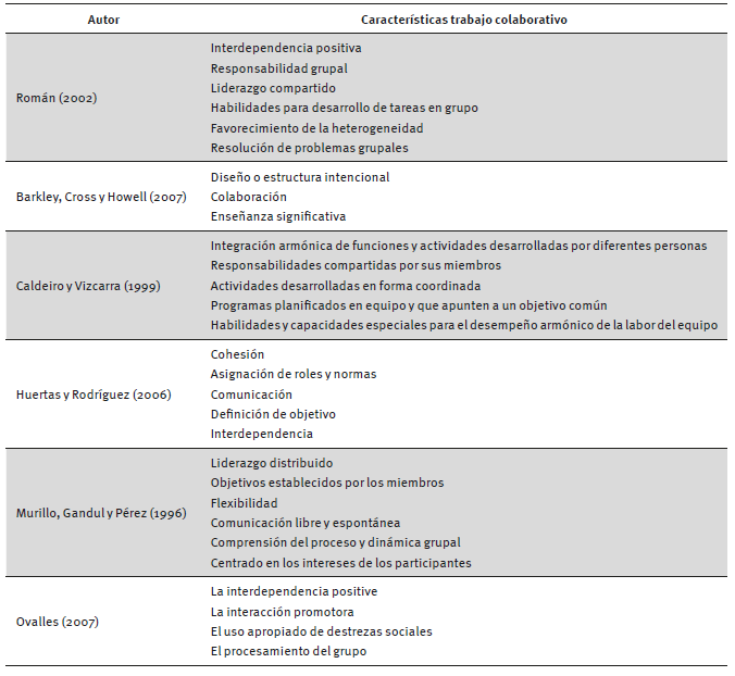 Se puede observar que aspectos tales como la interdependencia positiva, la responsabilidad compartida, el poseer un objetivo común y la cohesión grupal se encuentran ya sean expresados de igual manera o en palabras similares por varios de los autores que más trabajan las características del trabajo en equipo colaborativo.