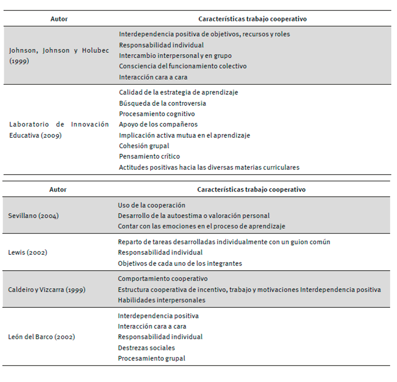 En lo que respecta a la tabla anterior, las características de trabajo cooperativo que son comunes para algunos de los autores citados pueden entenderse como: interdependencia positiva; responsabilidad individual; cohesión grupal y reparto individual de tareas.