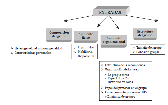 En esta figura, dentro de cada categoría (como son composición del grupo, ambiente físico, ambiente organizacional y estructura del grupo) se señalan los aspectos o entradas que deberían tenerse en cuenta previamente a la conformación de un equipo que adopte un modelo de trabajo cooperativo debido a que influyen en su desempeño.