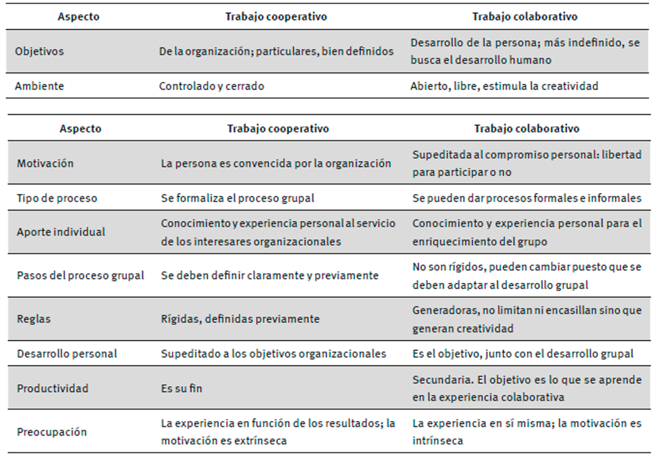 En la siguiente tabla se clasifican en forma estructurada las diferencias entre el trabajo cooperativo y el trabajo colaborativo en varios aspectos: