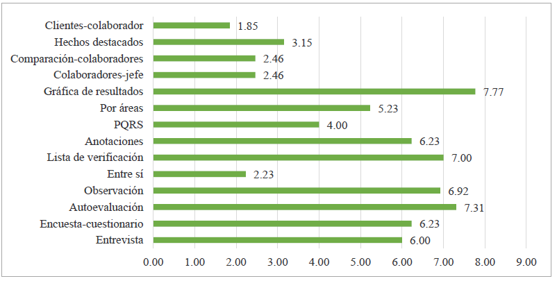 Aquellos modelos empleados para evaluar el desempeño son una representación simplificada de la realidad, en donde se tienen en cuenta elementos básicos que revelan los niveles de desempeño alcanzados por la organización (Kraenau, Santos de la Cruz y Canales del Mar, 2015). Las formas más empleadas para evaluar el personal en las IPS son: gráficas de resultados con 7,77 (frecuentemente); autoevaluación de los colaboradores con 7,31 (ocasionalmente) y también se realiza mediante una lista de verificación que es diligenciada por el jefe inmediato con 7 (ocasionalmente) (figura 4); de ahí la relevancia de que las organizaciones adapten sus propios instrumentos y que permitan al colaborador identificarse en el momento de la medición (Machorro and Romero, 2017).