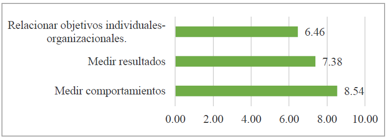 Se identificó también que en las organizaciones el proceso de evaluación de desempeño se encuentra sistematizado con 7,69 (frecuentemente) y este raramente ayuda a que los colaboradores se enfoquen en lo prioritario y estratégico (4,62) (figura 7). Para Montoya (2009) la evaluación de desempeño es una estrategia que involucra interacciones permanentes, lo que permite a los colaboradores participar y contribuir en la creación de estrategias para mejorar el desempeño de la organización.