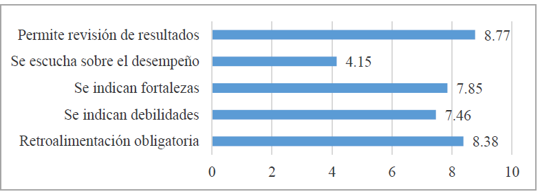 En este ejercicio se le indica al colaborador sus fortalezas (7,85) y debilidades (7,46) y raramente se le da la oportunidad de expresar los motivos de su desempeño (4,15) (figura 6). Expresar las fortalezas a los colaboradores es algo positivo dado que crea un lazo de confianza entre jefe y subordinado, además de señalar sus falencias para la mejora de su desempeño (Acosta, 2018; Brito- Carrillo, Pitre-Redondo and Cardona-Arbeláez, 2020). De igual modo la evaluación cualitativa y cuantitativa del desempeño implica el compromiso de los trabajadores para identificar así dificultades entre las actividades y los objetivos de la empresa.