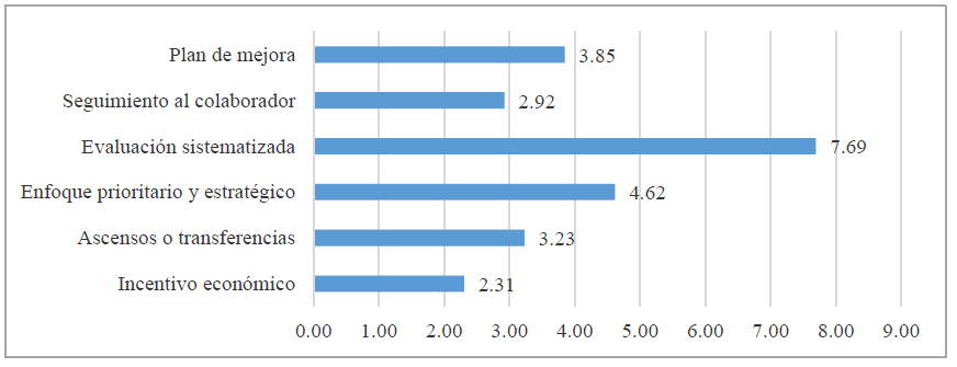 De igual manera el plan de mejora también es raramente utilizado (3,85) y los colaboradores casi nunca tienen acceso a ascensos o transferencias (3,23), así como a incentivos económicos (2,31) (figura 7). No obstante, Acosta (2018) encontró en este mismo sector que existía mayor facilidad para acceder a ascensos y a incentivos económicos de lo que se encontró a día de hoy. Esta situación no se debería dejar de lado puesto que influye en la motivación de los colaboradores. Por ello Castaño (2013) explica que la organización recurre a los resultados obtenidos en la evaluación para decidir sobre los cambios necesarios con respecto a la asignación de incentivos, remuneraciones económicas o para realizar capacitaciones.