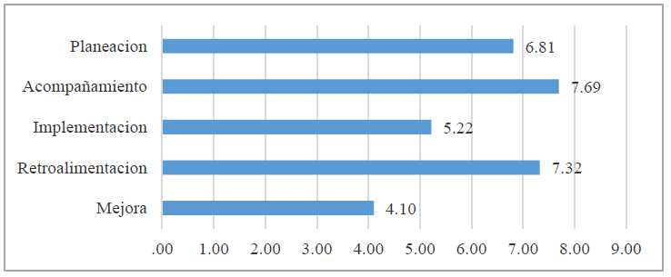 Después de analizar las fases de manera individual se realizó un promedio general de cada una de ellas para determinar en cuáles existen mayores fortalezas y en cuáles se presentan falencias. Se puede evidenciar que las fases de implementación y mejora requieren fortalecerse para enriquecer el proceso total de la gestión del desempeño y lograr un efecto positivo en los colaboradores y la organización (figura 8), lo cual es imprescindible porque los resultados de la evaluación sirven para identificar las necesidades de formación y desarrollo (Chávez, 2014). Por el contrario, también se afirma que anteriormente la evaluación del desempeño se restringía a la percepción del superior respecto al comportamiento del colaborador. Más adelante se establecieron diferentes modelos en la medida en que hoy se pueden encontrar ejemplos de evaluaciones de cuarta generación.