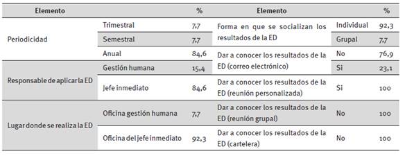 Teniendo en cuenta la herramienta MP04 se evidenció que el área de gestión humana en la mayoría de las IPS realiza la evaluación de desempeño de manera anual, en otros casos se realiza de manera semestral y trimestral en la que el jefe inmediato es el encargado de aplicar la evaluación a su personal a cargo y los resultados de esta se socializan de manera individual por medio de una reunión personalizada (tabla 1). Esta evaluación del desempeño se realiza en las organizaciones continuamente y de forma dinámica (Chiavenato, 2007), efectuándose de manera formal o informal.