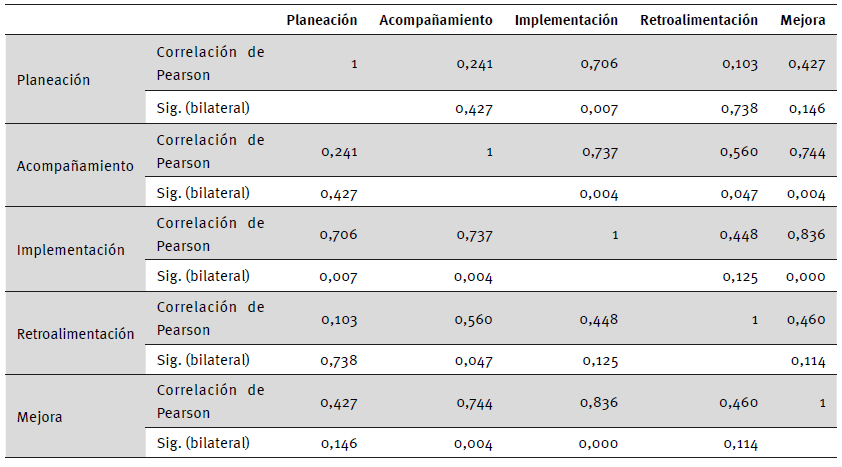 En cuanto a las fases entre sí, se demostró que las fases de planeación e implementación cuentan con una relación positiva (0,706); esto es coherente con lo que mencionan Becerra, Piñeros y Uribe (2018) dado que se presenta una relación directa entre la correcta planeación y gestión del desempeño de los colaboradores y la productividad, si cada empresa potencializa y mejora logrará fortalecer la productividad individual y empresarial y ser así más competitiva en el mercado. También se evidenció que existe un alto grado de correlación del acompañamiento con la implementación, mejora y retroalimentación (en menor grado) porque este contribuye al desarrollo adecuado de estas etapas; esto es congruente, ya que se reconoce el acompañamiento como una alternativa para mejorar la calidad (tabla 2).