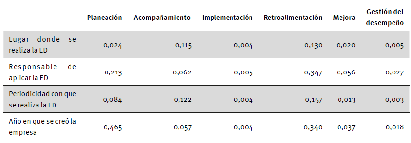 Además se encontró que el lugar donde se lleva a cabo la gestión del desempeño, el responsable de aplicarla, la periodicidad y el año en que fue creada la empresa, influyen significativamente en la implementación y mejora (tabla 3); de igual modo Velandia (2017) señala que muchos ejecutivos optan por ejecutar la evaluación de desempeño en el lugar de trabajo del colaborador, siendo lugares de constante interacción, así como también se efectúa en las oficinas de gestión del talento humano.