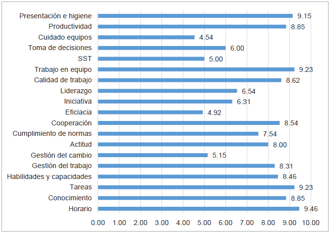 En cuanto a la planeación de la evaluación entre los elementos que las instituciones consideran más trascendentes se encuentran: el cumplimiento del horario laboral (9,46); el trabajo en equipo y cumplimiento de tareas (9,23) y la presentación e higiene (9,15). Toro (2015) resalta que el trabajo en equipo agrupa la conexión y la transformación de una organización, considerando la necesidad de mejora continua y cambios organizacionales para encaminarse al logro de la misión y visión, guiando el comportamiento de los colaboradores para alcanzar la calidad y productividad.