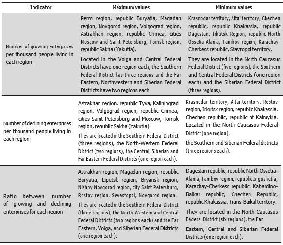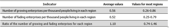 Also, study included testing of following four hypotheses: (i) how growing and fading enterprises in Russia appear relatively and rarely; (ii) values of four indicators under consideration have a significant differentiation in different regions of the country; (iii) in most regions number of growing enterprises exceeds number of declining enterprises; (iv) the territorial location of the country’s regions does not significantly affect maximum and minimum values for each indicator.