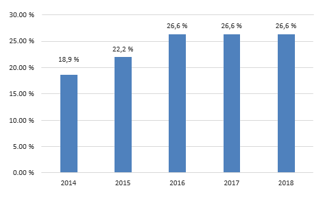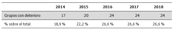Se observa que el 2014 es el año que presenta menor número de entidades con deterioro (18,9 %), aumentando en los siguientes ejercicios hasta alcanzar un porcentaje mantenido del 26,6 % entre 2016 y 2018.