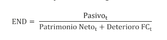 Para el cálculo del endeudamiento —END— se ha seguido la forma tradicional a través de la relación entre el pasivo y el patrimonio neto, este último corregido por el deterioro del fondo de comercio. Analíticamente quedaría de la siguiente manera: