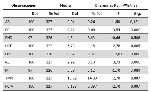 Al diferenciar entre los grupos que muestran deterioro en sus cuentas de los que no lo hacen —con el objeto de averiguar si presentan diferencias significativas en las variables utilizadas en el estudio— se ha aplicado el test no paramétrico de Mann-Whitney, tras comprobar previamente a través del contraste de Kolmogorov-Smirnov que las variables no seguían una distribución de normalidad.