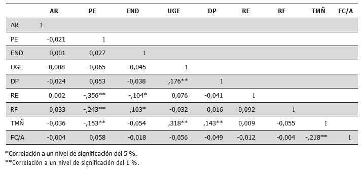 Para detectar cualquier efecto de colinealidad entre las variables independientes se calculó el coeficiente de correlación de Pearson (tabla 5), aquí se aprecia que no hay valores superiores a 0,5; de ahí que el grado de correlación que existe entre las variables independientes sería bajo.