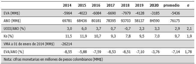 El MS generó un promedio anual del EVA porque el índice UODI/ANO promedio superó el Ko promedio; en virtud de lo cual se creó valor por $ 821 MM en los siete años, que fue el VMA a 01 de enero de 2014. El porcentaje promedio del EVA que el MS concedió a sus empresarios por lo invertido en el ANO fue del 4,70 %.