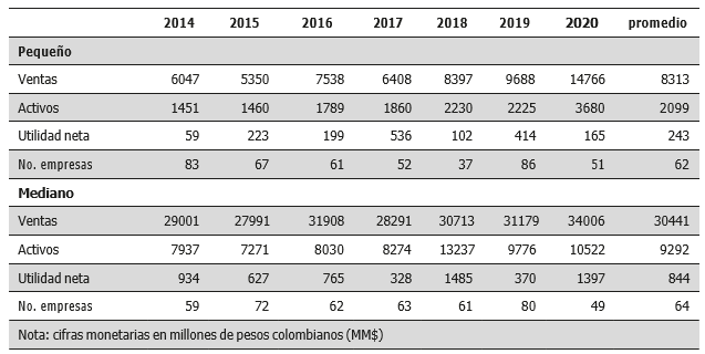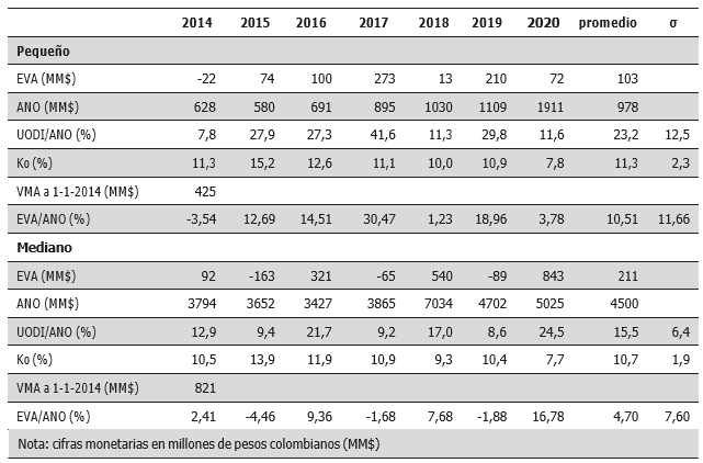 Los índices contables y de administración de valor se calcularon con base en los estados financieros del período 2014-2020 de los pequeños y medianos supermercados en Colombia[3], estos fueron tomados de EMIS Professional (2021); así pues, de su página Web se obtuvo información de un promedio de 62 supermercados pequeños y 64 supermercados medianos. De igual manera el tamaño se fijó conforme al artículo 2 de la Ley 905 de 2004. Por su parte, la información del mercado se obtuvo principalmente de Damodaran (2021) y Superintendencia Financiera de Colombia (2021).