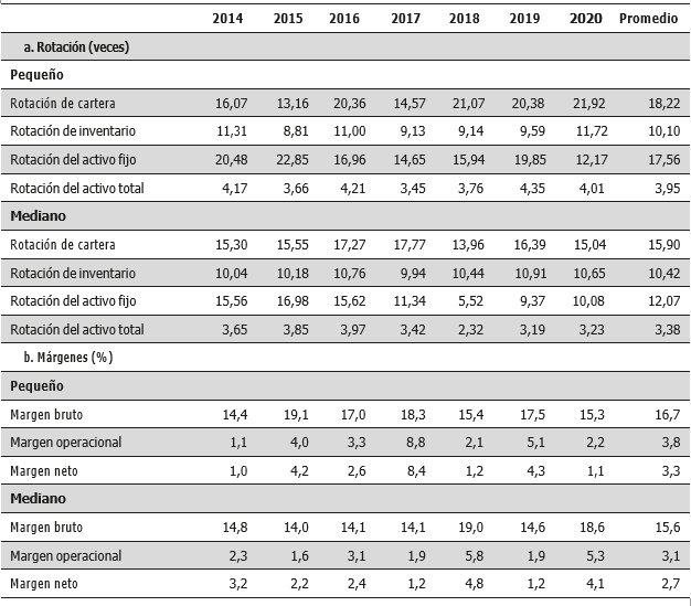 De igual manera el PS obtuvo un promedio de rotación del activo total superior al del MS (3,95 versus 3,38 veces), impulsado por la mayor rotación cartera (18,22 versus 15,90 veces) y del activo fijo (17,56 versus 12,07 veces); mientras que en la rotación de inventario fue rebasado por el MS (10,42 versus 10,10 veces). Por tanto, se comprobó que en el período 2014-2020 el PS fue más eficiente en el empleo de sus activos.