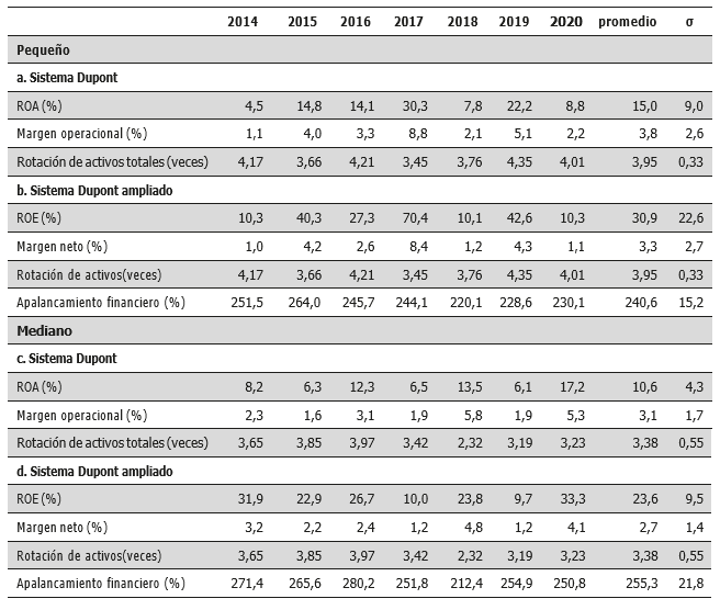 El ROA del PS no todos los años fue superior al del MS, este último lo superó en 2014, 2018 y 2020. Al cotejar los factores del sistema Dupont se encontró que el promedio del margen operacional del PS (3,8 %) fue superior al del MS (3,1 %), aunque el MS lo logró superar en 2014, 2018 y 2020; de este modo el promedio de la rotación de activos del PS (3,95 veces) fue mayor al del MS (3,38 veces), superioridad que se reincidió cada año, salvo en 2015. Por ello se puede deducir que la mayor efectividad del PS, estimado por el ROA, fue resultado de su mayor eficacia en el control de costos-gastos operacionales y a su mayor eficiencia en la utilización de los activos.