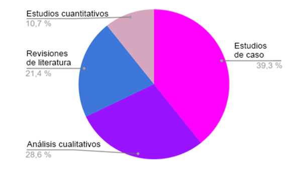 En el análisis realizado se identificó la influencia de estudios de caso (39,3 %) y análisis cualitativos (28,6 %), seguidos por revisiones de literatura (21,4 %) y estudios cuantitativos (10,7 %). Esta distribución subraya la importancia de comprender a profundidad las experiencias específicas de implementación de herramientas de contabilidad de gestión en diversos contextos.