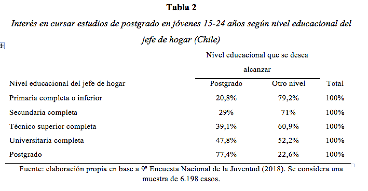 Continuando con el caso chileno, se puede apreciar que a pesar de los avances en términos de acceso a la educación superior, la MEI continúa siendo un factor de gran relevancia para comprender la continuidad y desplazamiento de las desigualdades socioeducacionales de origen, siendo el nivel educacional del jefe de hogar una de las principales variables relacionadas con el nivel educacional que los jóvenes desean alcanzar. Como se observa en la tabla 2, el 20,8% de jóvenes proveniente de hogares donde el nivel educacional alcanzado por el jefe de hogar es la educación primaria completa o inferior se interesa en lograr estudios de postgrado. Este porcentaje aumenta a un 29% en jóvenes cuyo jefe de hogar logró la educación secundaria completa. Sin embargo, esta relación cambia drásticamente en jóvenes cuyo jefe de hogar alcanzó estudios de postgrado, ya que más del 70% de estos jóvenes se interesa en alcanzar estudios de magister o doctorado, la mayor parte provenientes de los estratos con mayores recursos.