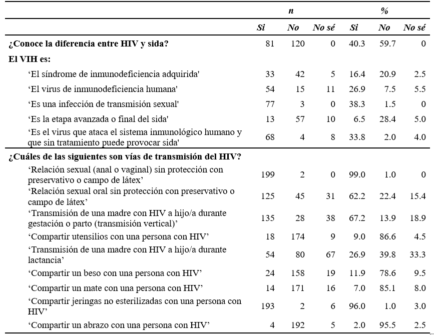 La Tabla 2 expone las frecuencias absolutas y porcentuales en relación al conocimiento sobre la diferencia entre VIH y sida. El 59.7% (n = 120) autorreportó no conocer la diferencia. El 40.3% restante (n = 81) fue indagado sobre cinco afirmaciones, a los fines de evaluar su conocimiento (de forma consecutiva, el patrón correcto de respuesta era: ‘No’, ‘Si’, ‘Si’, ‘No’, ‘Si’). Sólo un 13.9% de la muestra (n = 28) pudo dar cuenta cabal de su conocimiento acerca de la diferencia entre VIH y sida, mientras que el restante 25.9% (n = 52) respondió incorrectamente alguno de los ítems.