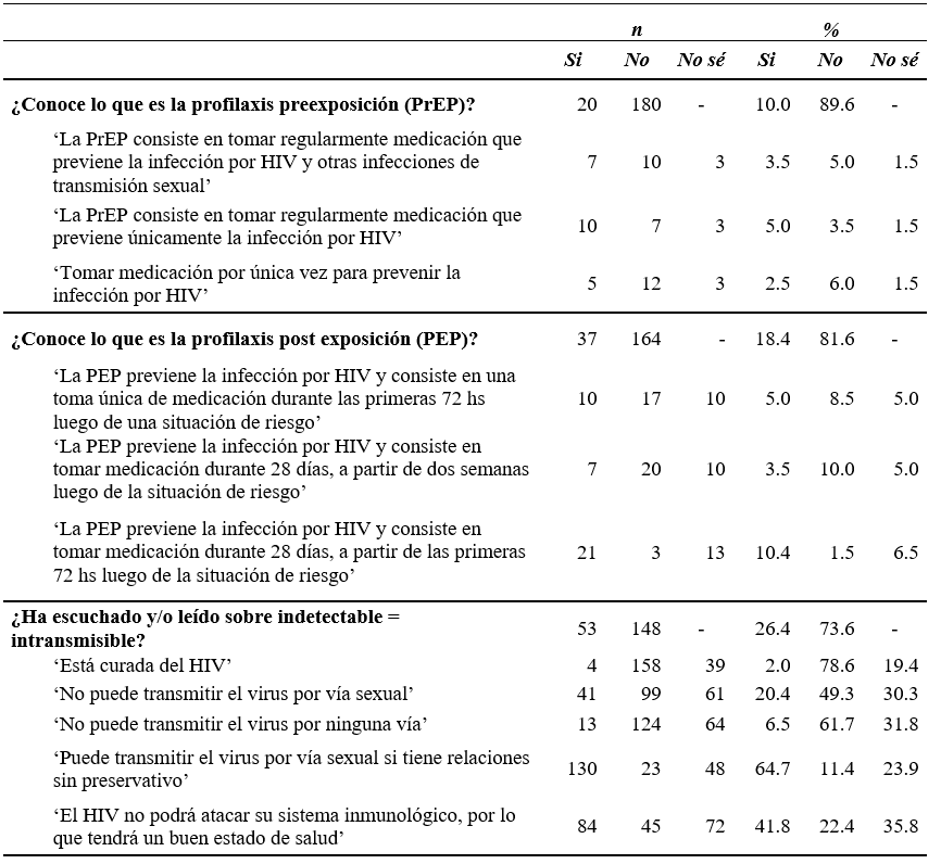 En la Tabla 3 se exponen las frecuencias absolutas y porcentuales relativas al conocimiento sobre la PrEP, la PEP e I=I. Solamente el 10% (n = 20) consignó conocer la PrEP y el 18.4% (n = 37) la PEP. Sólo el 2.5% (n = 5) respondió acertadamente los ítems para evaluar la comprensión de la PrEP (consecutivamente, respuestas correctas: ‘No’, ‘Si’, ‘No’). Los individuos con las tres respuestas correctas referidas al PEP (consecutivamente: ‘No’, ‘No’, ‘Si’) conformaron el 4% (n = 8) de la muestra.