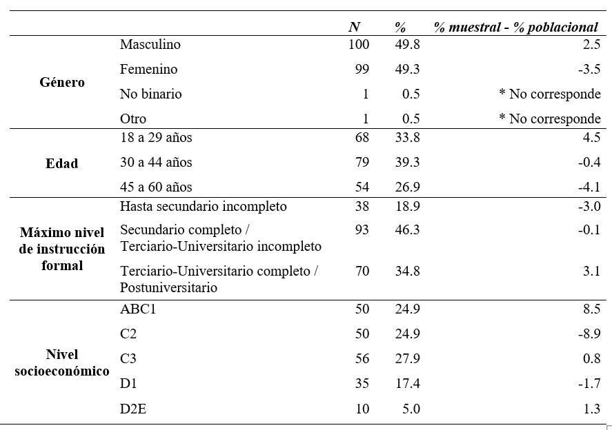 En la Tabla 1 se observan las frecuencias absolutas y porcentuales en relación a género, franja etaria, máximo nivel de instrucción formal y nivel socioeconómico. La tercer columna arroja el diferencial entre el porcentaje observado en la muestra y las estimaciones poblacionales en cada categoría de las variables (ver los parámetros en Población y tipo de estudio). En género, franja etaria y máximo nivel de instrucción formal todas las diferencias se encontraron por debajo de los cinco puntos porcentuales, lo cual indica un adecuado nivel de aproximación de la composición muestral a la distribución poblacional. En la variable nivel socioeconómico, se observa una leve sobrerrepresentación del estrato ABC1 en la muestra (+8.5%) y una subrepresentación del estrato C2 (-8.9%).