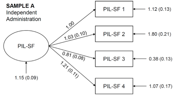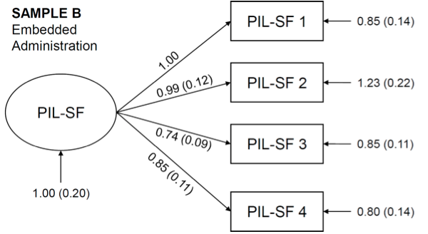 As shown in Table 2, the model demonstrated excellent fit for a 1-factor model by the indices calculated. When administered both independently (Sample A) and embedded in the long form (Sample B), the PIL-SF fit was above the cutoff for the CFI and the Tucker-Lewis Index TLI, within recommended range for the RMSEA and RMSEA confidence interval (both were close to zero), and below the cutoff for SRMR (cutoffs from Hooper et al., 2008). For the long form of the PIL, fit statistics were inadequate, or outside of conventional cutoffs, for three of the indices that have conventional cutoffs (χ2, CFI, TLI). The RMSEA and SRMR had acceptable fit for the long form, but poorer fit than the PIL-SF did on these indices. As shown in the structural model for Sample A (Figure 1) and Sample B (Figure 2), all four PIL-SF items loaded well onto the overall factor.