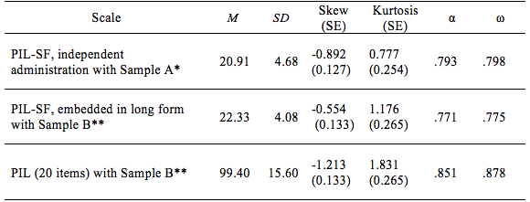 As shown in Table 1, McDonald’s omega for the PIL-SF was adequate for Samples A and B (based on cutoffs from Dunn et al., 2014; Green & Yang, 2015). Internal consistency calculated with Cronbach’s alpha was also adequate for the PIL-SF with both samples (based on cutoffs from DeVellis, 2003). Across administrations for Samples A and B, the PIL-SF means, standard deviations, and alpha coefficients were similar.