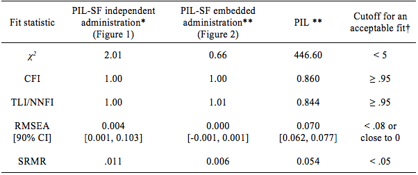 For Sample A, Pearson correlations of each item with the other items in the independently administered PIL-SF were acceptable, 0.38 < r < 0.62, all p’s < .001 (Kline, 2005). For Sample B, Pearson correlations of each item with the other items in the PIL-SF as embedded in the long form were also acceptable, 0.42 < r < 0.51, all p’s < .001 (Kline, 2005).