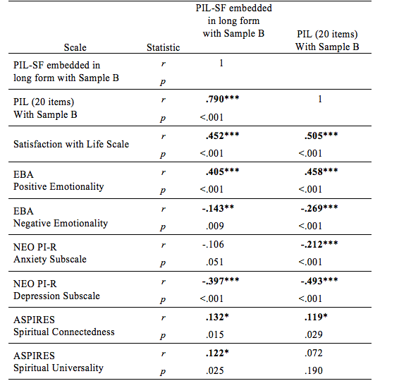 As shown in Table 3, with Sample B, bivariate Pearson correlations were computed between the PIL, PIL-SF, and the measures of wellbeing (Satisfaction with Life Scale (SWLS), EBA Positive), negative emotions (EBA Negative, NEO PI-R Anxiety, NEO PI-R Depression), and spirituality (ASPIRES Connectedness and Universality subscales). The PIL-SF and PIL were strongly correlated with each other. Both the PIL and PIL-SF had similar correlation coefficients indicating moderate, significant, positive correlations with satisfaction with life and positive emotionality. Both the PIL and PIL-SF had similar correlation coefficients indicating significant correlations with negative emotionality (weak) and depression (moderate). The PIL was significantly correlated with anxiety but the PIL-SF was not. Both the PIL and PIL-SF were weakly, significantly, positively correlated with spiritual connectedness. Only the PIL-SF was significantly and positively, albeit weakly, correlated with universality.