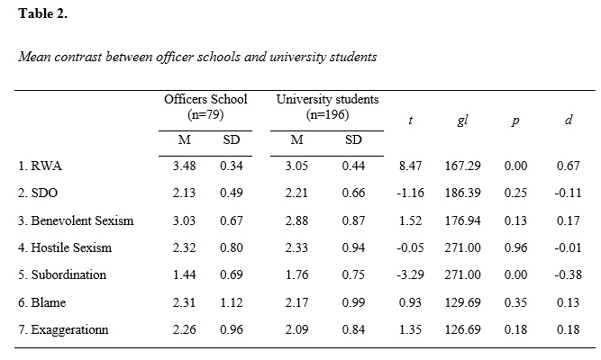 In response to the main objective and the first hypothesis, statistical tests to determine if there were significant differences between students from an officer school and a university were conducted. Thus, in relation to ideology, police trainees showed statistically significant higher scores on RWA, while university students scored higher on SDO, although this difference was only reported at the descriptive level.