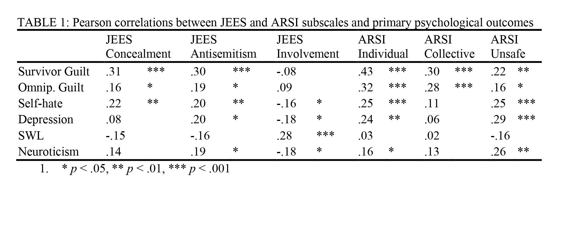 Two instruments measuring levels of antisemitism were included; the Jewish Ethnic Experience Scale (JEES; Kosdon, O?Connor, & Berry, 2019) developed for this study and the Antisemitism Related Stress Inventory (ARSI; Rosen, Kuczynski, & Kanter, 2018). Widely used and validated measures of depression, life satisfaction, the Big Five personality factors, and levels of empathy-based guilt were included. A subsample of 122 participants wrote narrative responses to open-ended questions about their personal experiences as Jews.