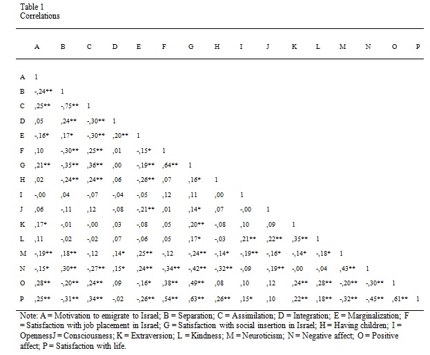 Our assumption, at the onset of this project, is that a person?s tendency for neuroticism and introversion correlates negatively with their well-being and integration in the context of migration. Acculturation does not occur naturally but requires an active involvement trying to adapt and participate in this foreign society. Migration to Israel to be a central event in the identities of Jewish Latin American immigrants (Simkin, 2020) Therefore, we hypothesize that an individual with a low level of subjective well-being will experience more difficulties when trying to interact with Israelis and become part of their culture. Not being able to interact with strangers, refusing to learn about the new culture, Israeli politics and the inability to meet new people will probably have a negative effect on the individual?s acculturation. It is important to note that the four strategies are neither static nor are they end outcomes in themselves (Berry & Sam, 2010).