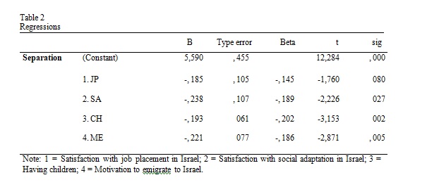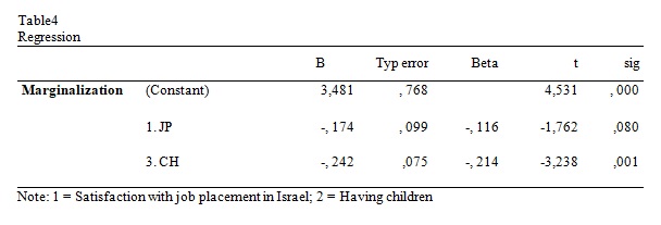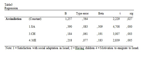 Later, a regression analysis was performed to evaluate the impact of the independent variables on the dependentvariable, acculturation. In other words, the migrant?s motivation to migrate to Israel, satisfaction with life, employment, social adaptation, their level of consciousness, neuroticism, negative and positive affect, and the fact of (not) having children were analyzed with the help of Berry?s four categories of acculturation ( Berry, 2006): integration, assimilation, separation and marginalization. As shown in Table 2, the motivation to emigrate to Israel, employment, and social circumstances, and (not) having children were observed.
