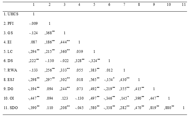 Regarding EJS, there is a weak to moderate negative correlation (r= -.298, p<.01) between Economic System Justification and the support of a universal and free health care system. There is a weak to moderate positive correlation (r= .297, p<.05) between Economic System Justification and the belief that the intervention of police forces was necessary to comply with the measures against the coronavirus pandemic. There is a moderate positive correlation (r= .302, p<.05) between Economic System Justification and the growth of support for the government after the coronavirus pandemic began. There is a strong positive correlation (r= .565, p<.05) between Economic System Justification and the growth of support of a liberal-capitalist state after the coronavirus pandemic began. The higher people are on the ESJ scale, the more they support a liberal- capitalist state. There is a weak negative correlation (r= -.154, p<.05) between Economic System Justification and the growth of support of a more a social-democratic state than before the coronavirus pandemic began.